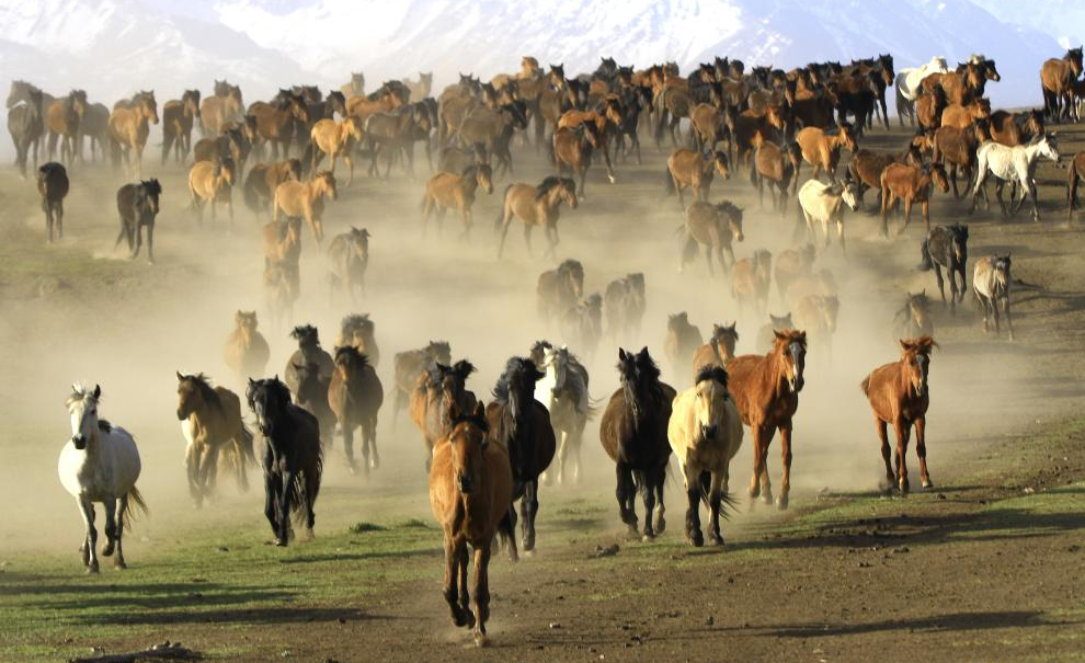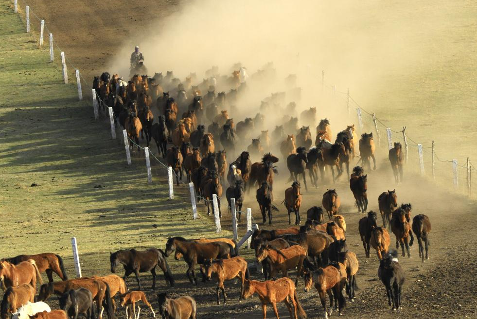 5月19日,甘肅張掖,數百匹駿馬奔馳在山丹馬場(chǎng)的草原上,牧人揚鞭,群馬奮蹄,場(chǎng)面壯觀(guān)。