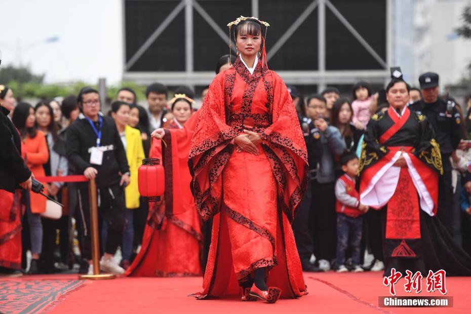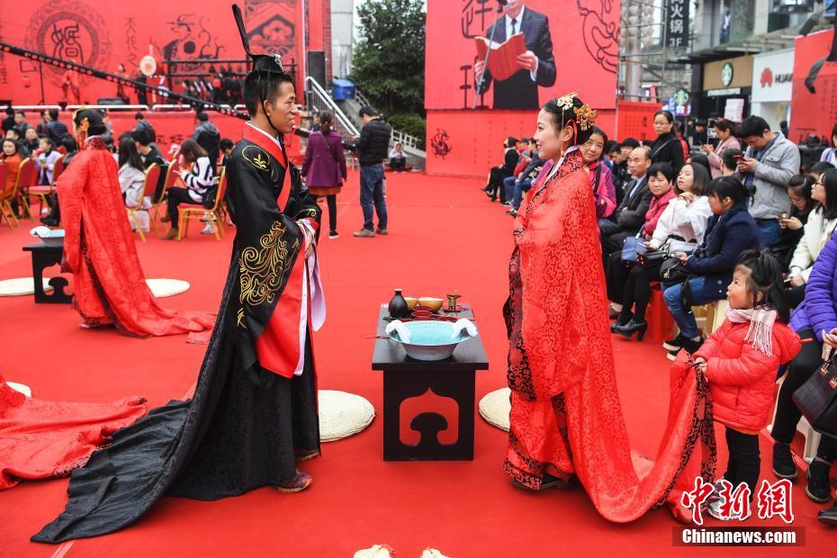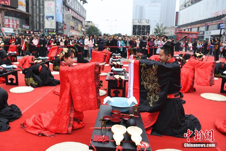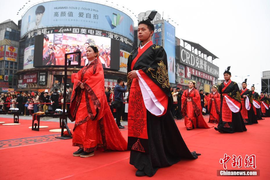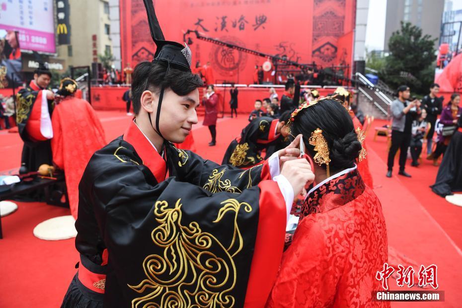 1112日,一場(chǎng)復古的漢式公益集體結婚大典在湖南長(cháng)沙舉行,31對新人身穿漢家衣裳,在贊禮官帶領(lǐng)下進(jìn)行醮子、恭迎、沃盥、祈福、同牢等禮節,將兩千年前的漢朝婚禮展現給眾人。