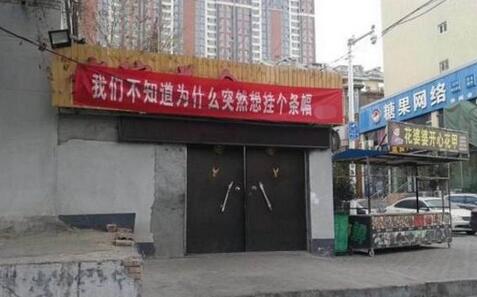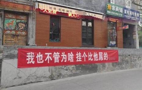 11月24日,在河南新鄉市東大街上,一家飯店的門(mén)頭上掛出一個(gè)條幅,內容是“我們不知道為啥,突然想掛個(gè)條幅”。隨后其他商家也紛紛跟進(jìn),開(kāi)始了一場(chǎng)幽默的“條幅大戰”。大家相互配合,圍繞第一個(gè)條幅的內容向外延伸,腦洞大開(kāi)。條幅的內容語(yǔ)氣都比較幽默,讓人看了忍不住就想笑。商家的神創(chuàng )意成功引起了路過(guò)市民的注意。還有市民專(zhuān)門(mén)跑到這條街上來(lái)看熱鬧。
