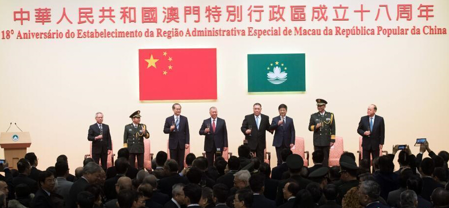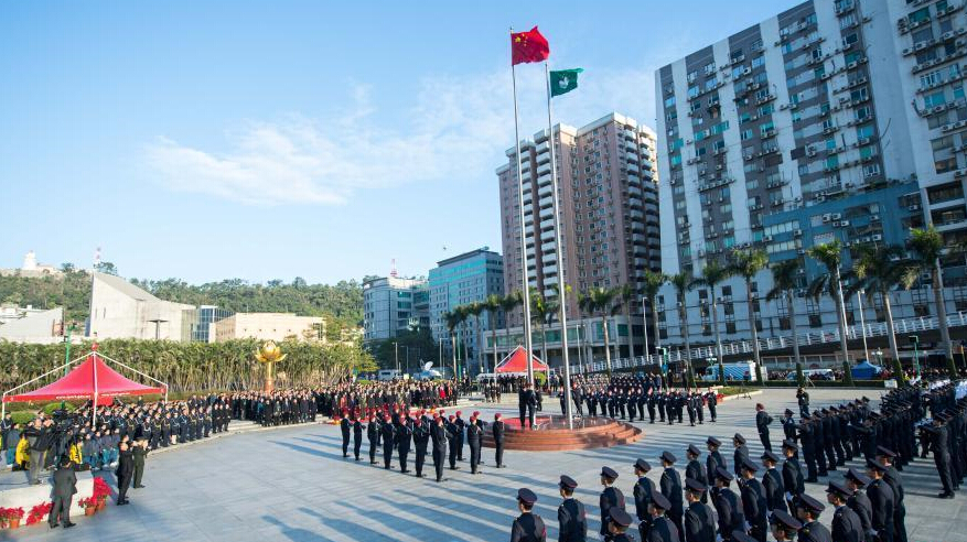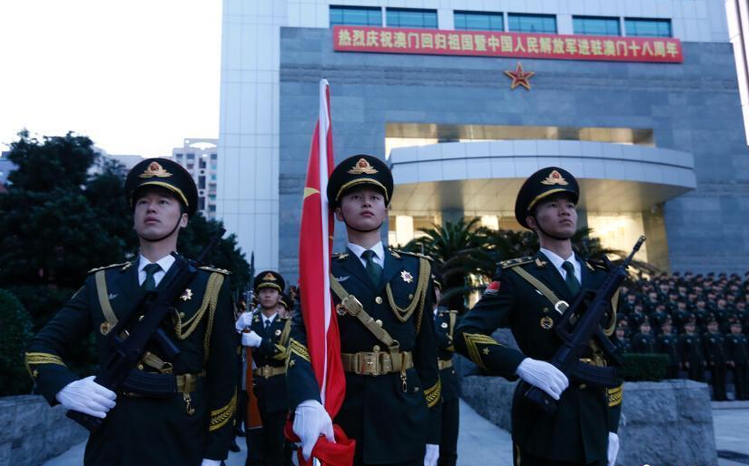 12月20日上午,駐澳門(mén)部隊在澳門(mén)新口岸營(yíng)區和珠海正嶺營(yíng)區、洪灣營(yíng)區同步隆重舉行升國旗儀式,慶祝澳門(mén)回歸祖國暨中國人民解放軍進(jìn)駐澳門(mén)18周年。圖為新口岸營(yíng)區駐軍官兵面向冉冉升起的五星紅旗莊嚴敬禮,為祖國和澳門(mén)獻上深深的祝福。