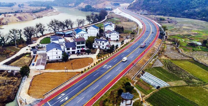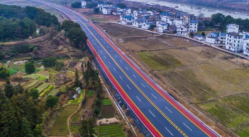 1月1日,航拍即將建成通車(chē)的江西省上饒市鉛山縣河永快速通道(河口至永平),該快速通道是鉛山首條彩色公路,宛如彩帶穿行于秀美鄉村之間。