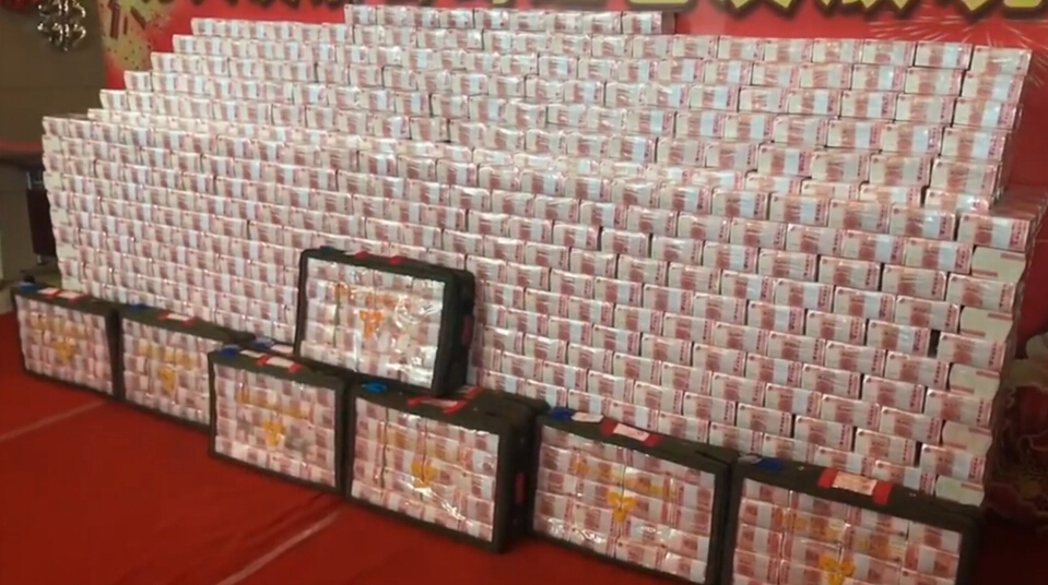 1月30日,甘肅蘭州,某公司給每位員工發(fā)了5萬(wàn)元紅包,年終獎現金堆成一堵墻。