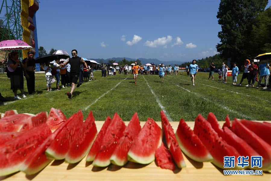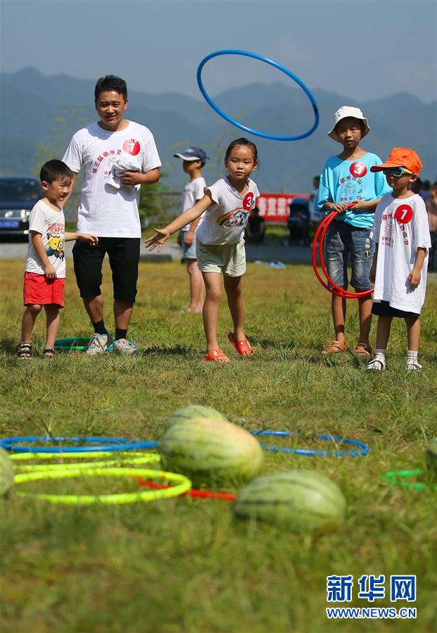 7月29日,在黃山市徽州區靈山村,游客參加西瓜趣味運動(dòng)會(huì )。當日,一場(chǎng)別開(kāi)生面的西瓜趣味運動(dòng)會(huì )在安徽省黃山市徽州區靈山村上演,人們參加吃瓜比拼、西瓜套圈、抱瓜賽跑等趣味比賽,歡樂(lè )度夏。