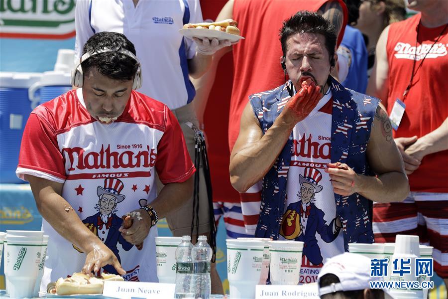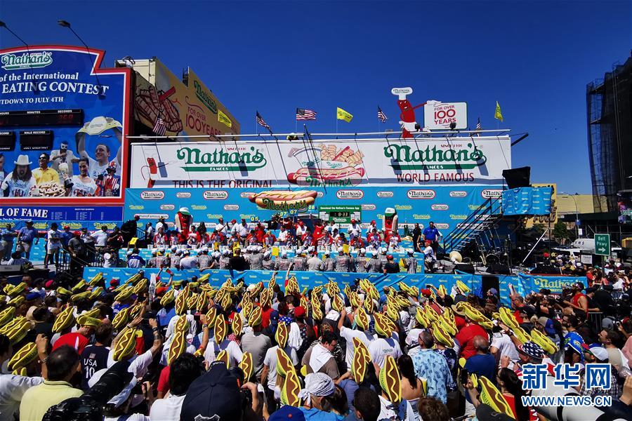 7月4日,在美國紐約康尼島,人們觀(guān)看吃熱狗大賽。 當日,美國紐約康尼島舉行一年一度的吃熱狗大賽。在男子組比賽中,來(lái)自加州的喬伊·切斯特納特10分鐘內吃下71個(gè)熱狗衛冕成功。在女子組比賽中,三木須藤10分鐘內吃下31個(gè)熱狗,連續第六次贏(yíng)得冠軍。