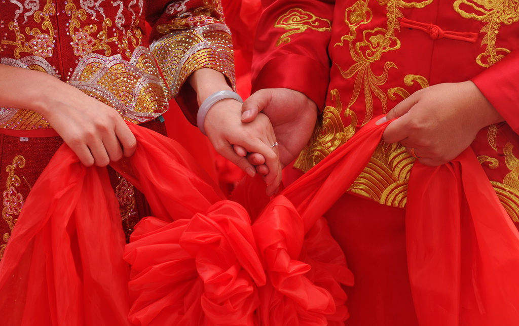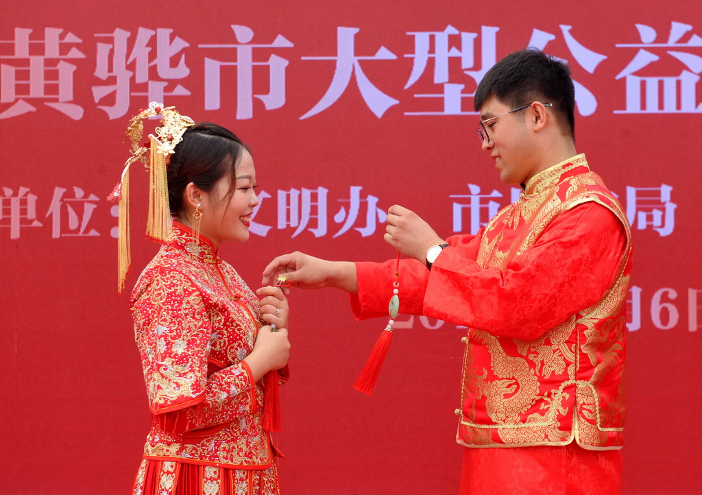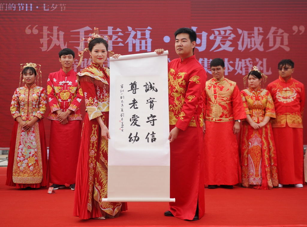 8月6日,河北省黃驊市在南海公園舉辦“執手幸!閻(ài)減負”大型公益集體婚禮。10對新人身穿中式傳統婚服執手入場(chǎng),倡導“喜事新辦、婚事簡(jiǎn)辦”新理念,引領(lǐng)文明節儉的婚嫁新風(fēng)尚。