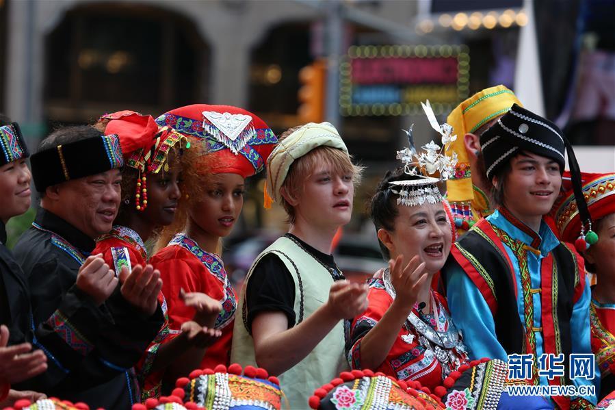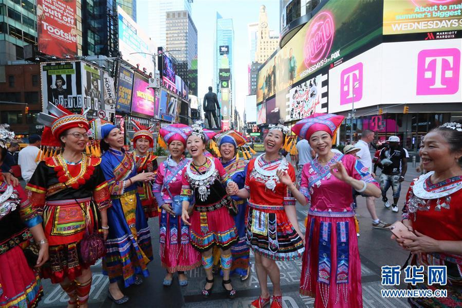 8月10日,在美國紐約時(shí)報廣場(chǎng),人們穿著(zhù)中國少數民族服裝演唱山歌。 當日,紐約當地廣西社團組織“鄉音播全球 山歌頌中華”活動(dòng),100多名華僑華人和外國友人歡聚一堂,將《山歌好比春江水》《多謝了》等中國民歌唱響紐約時(shí)報廣場(chǎng)。