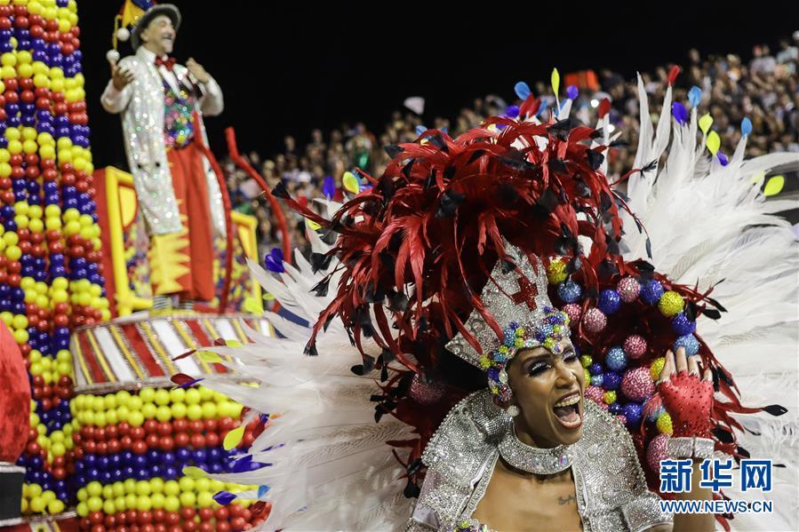2月22日凌晨,巴西圣保羅桑巴舞校的演員參加狂歡節巡游。 2月21日深夜至22日清晨,2020年巴西圣保羅狂歡節桑巴舞校巡游開(kāi)幕,7支特級組桑巴舞校的隊伍在桑巴大道獻上精彩表演。在接下來(lái)的三天中,還會(huì )有7支特級組隊伍、8支甲級組隊伍和12支乙級組隊伍進(jìn)行表演。