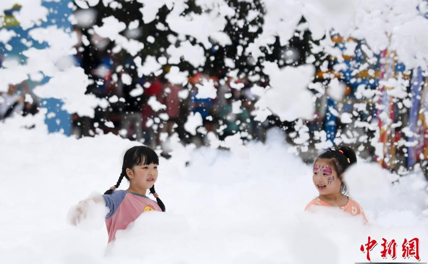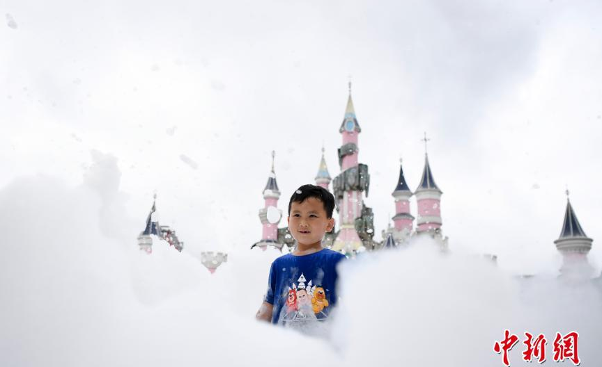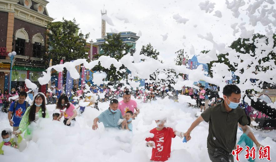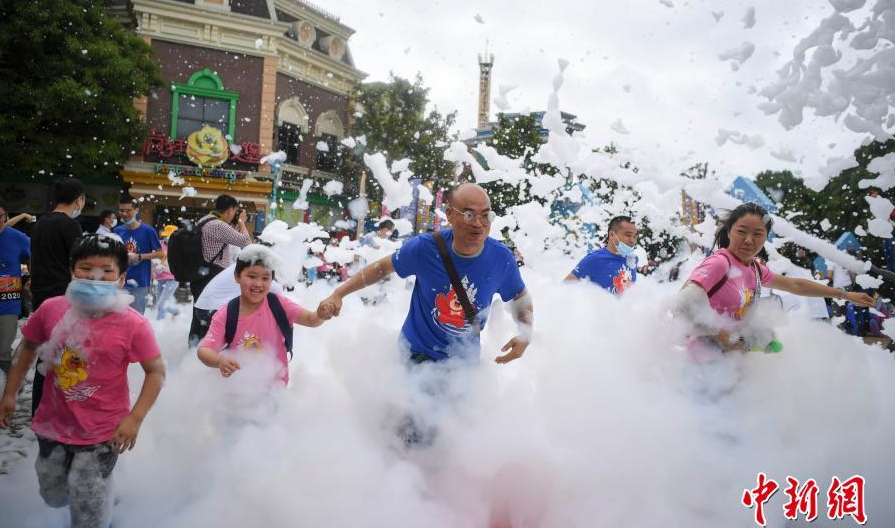 5月30日,家長(cháng)帶著(zhù)孩子在泡泡中奔跑。當日,湖南株洲方特舉行泡泡跑,迎接即將到來(lái)的兒童節。