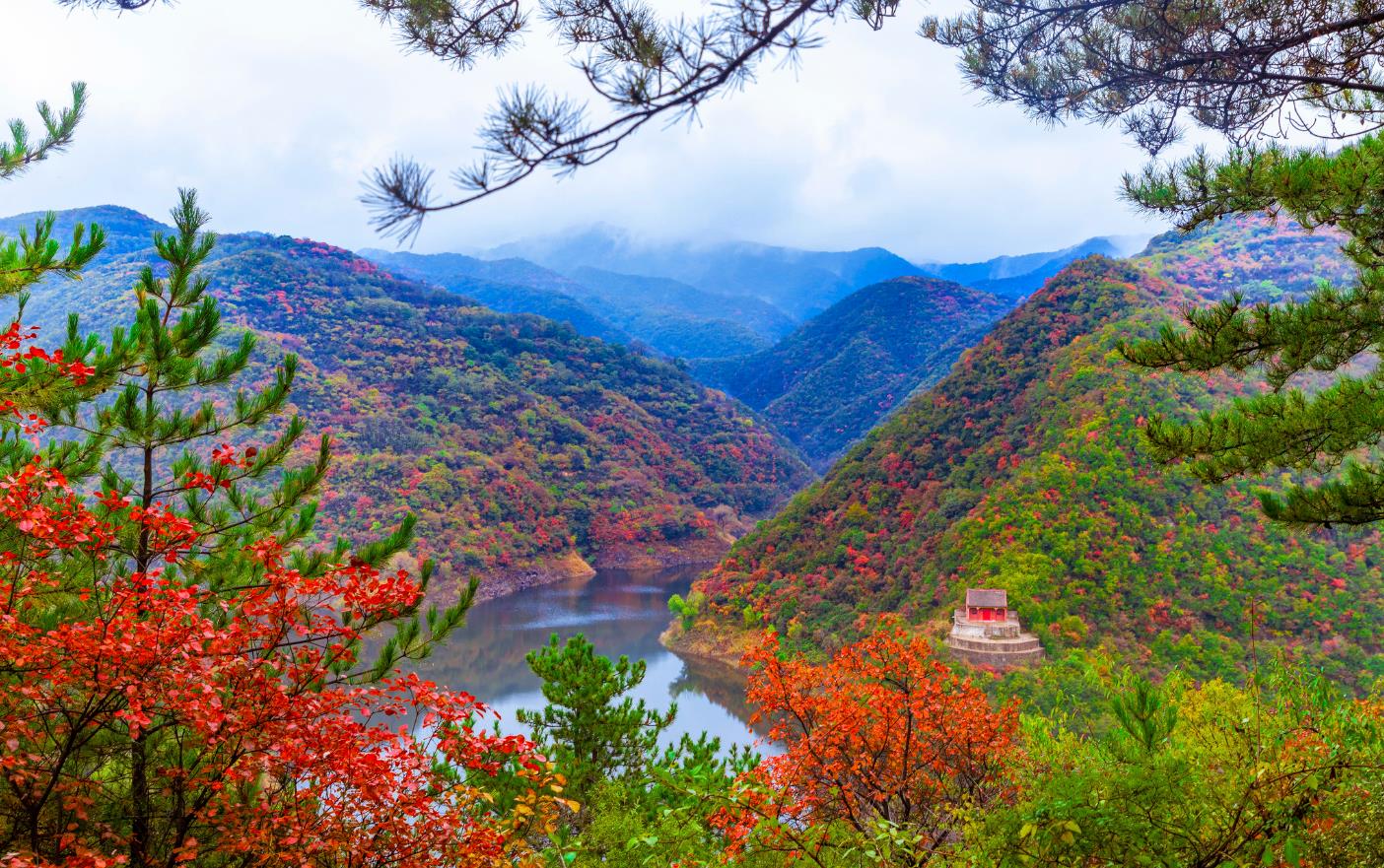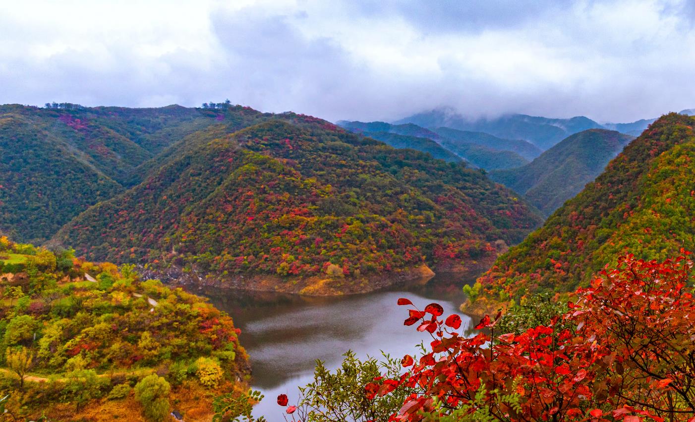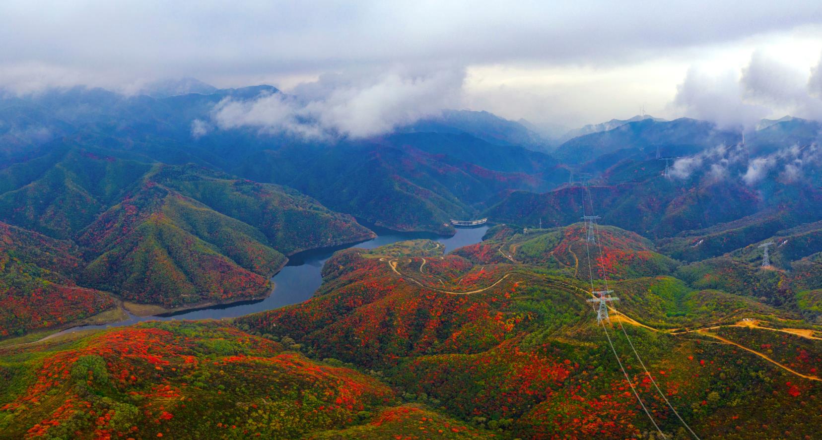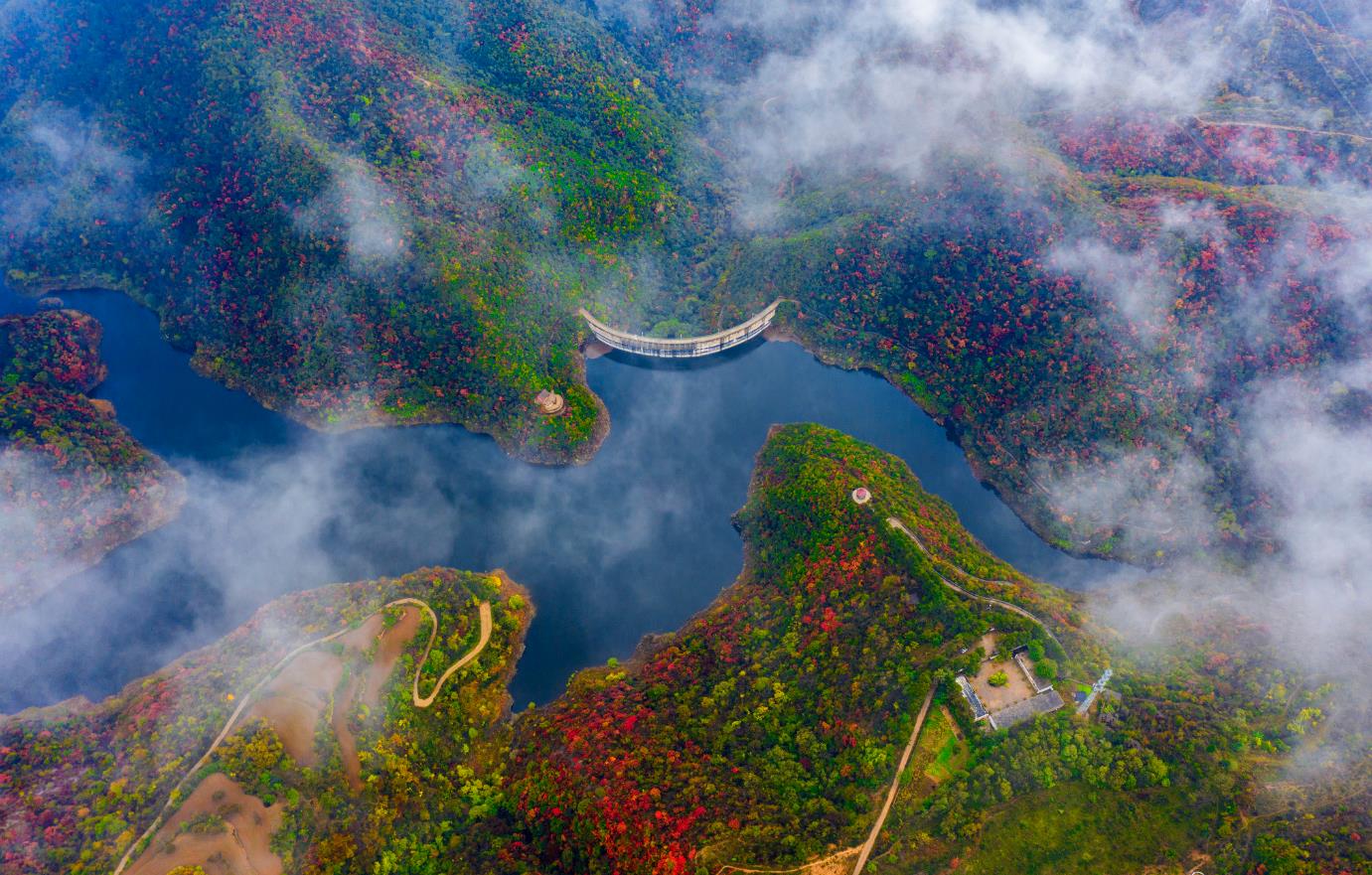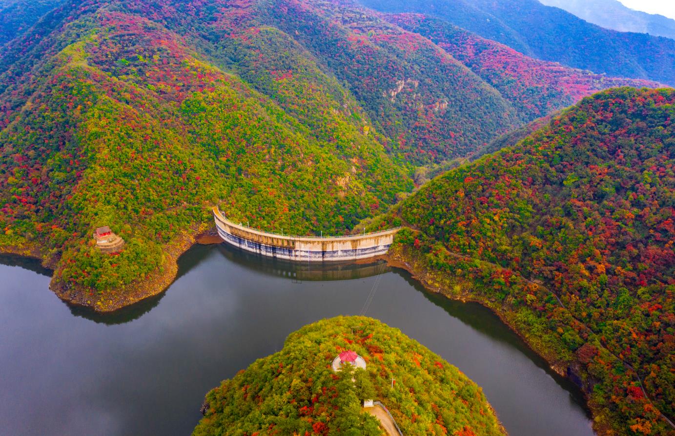 2020年10月14日金秋十月,鳥(niǎo)瞰山西省平陸縣大河廟水庫,層林盡染,紅葉綠水,藍天白云,風(fēng)景如畫(huà),水庫修建在層巒疊嶂萬(wàn)畝蔥蘢的中條山腹地。從空中俯瞰,漫山的紅葉映襯湖水,色彩斑斕仿佛仙境,給人一種心曠神怡的感覺(jué)宛如十里畫(huà)廊。