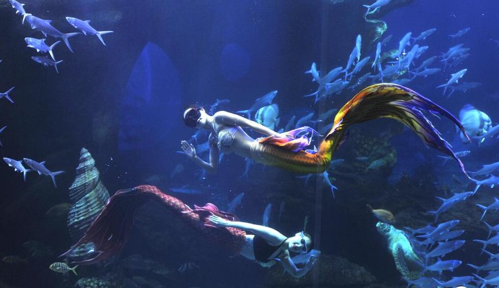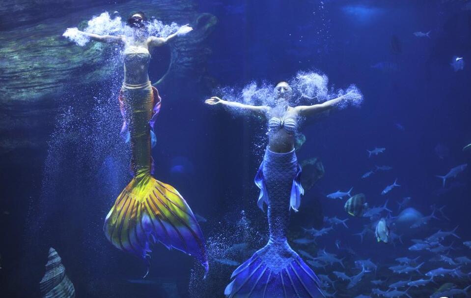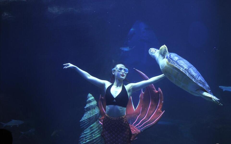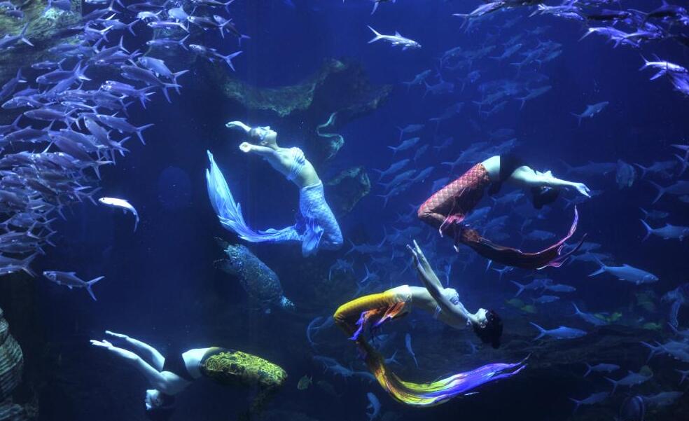 2021年5月4日,“美人魚(yú)”在貴州省貴陽(yáng)市海洋世界表演。五一假期,在多彩貴州城極地海洋世界,五名來(lái)自貴州的女演員為游客進(jìn)行水下芭蕾和美人魚(yú)等節目表演,優(yōu)雅的水下身姿吸引了眾多游客。